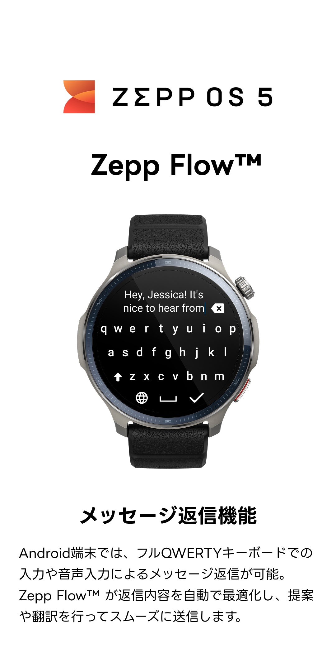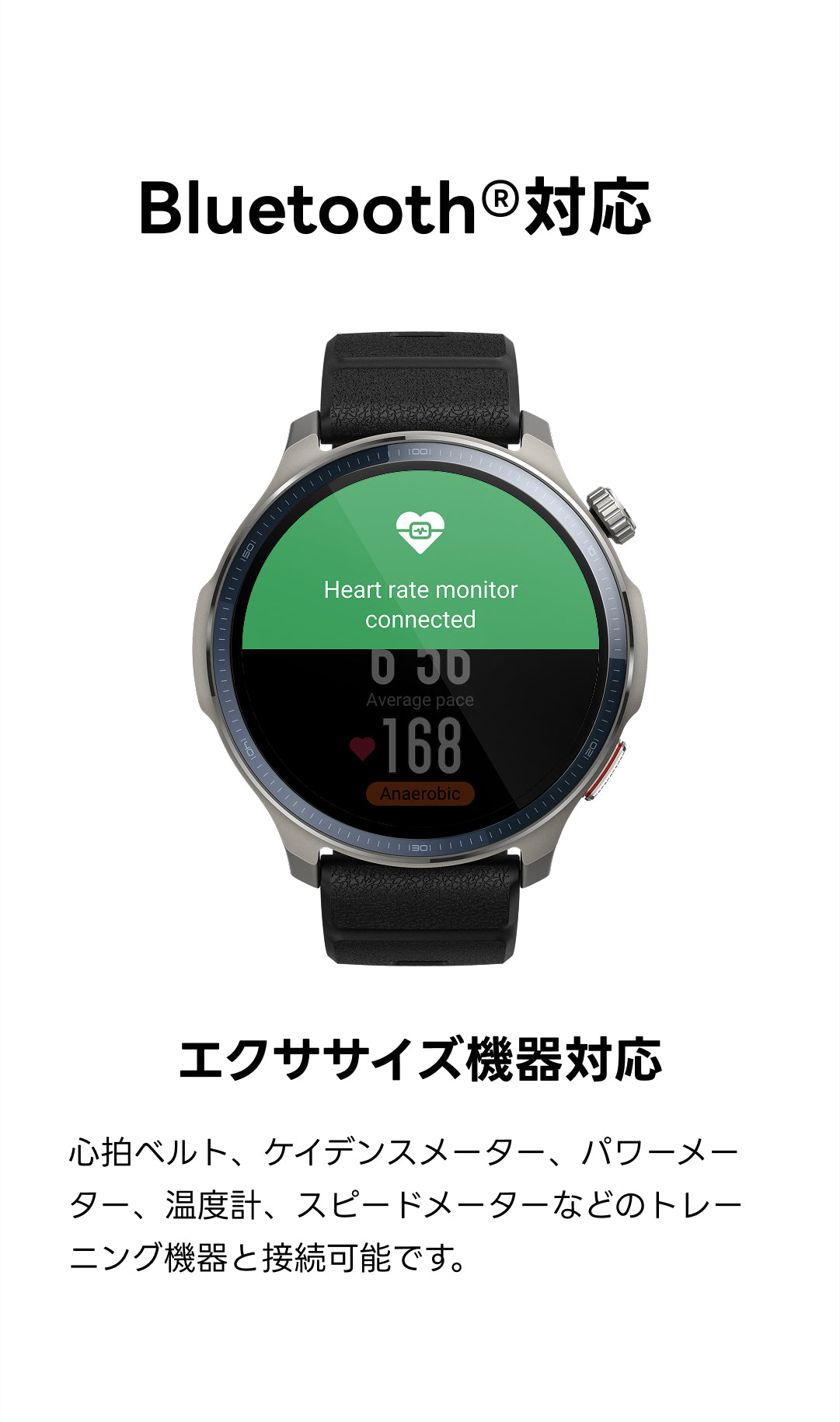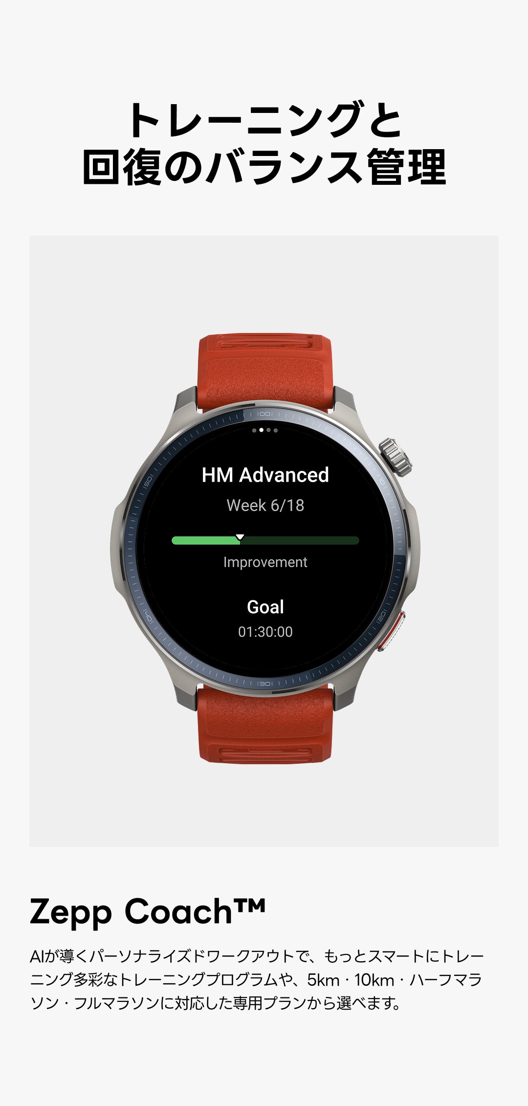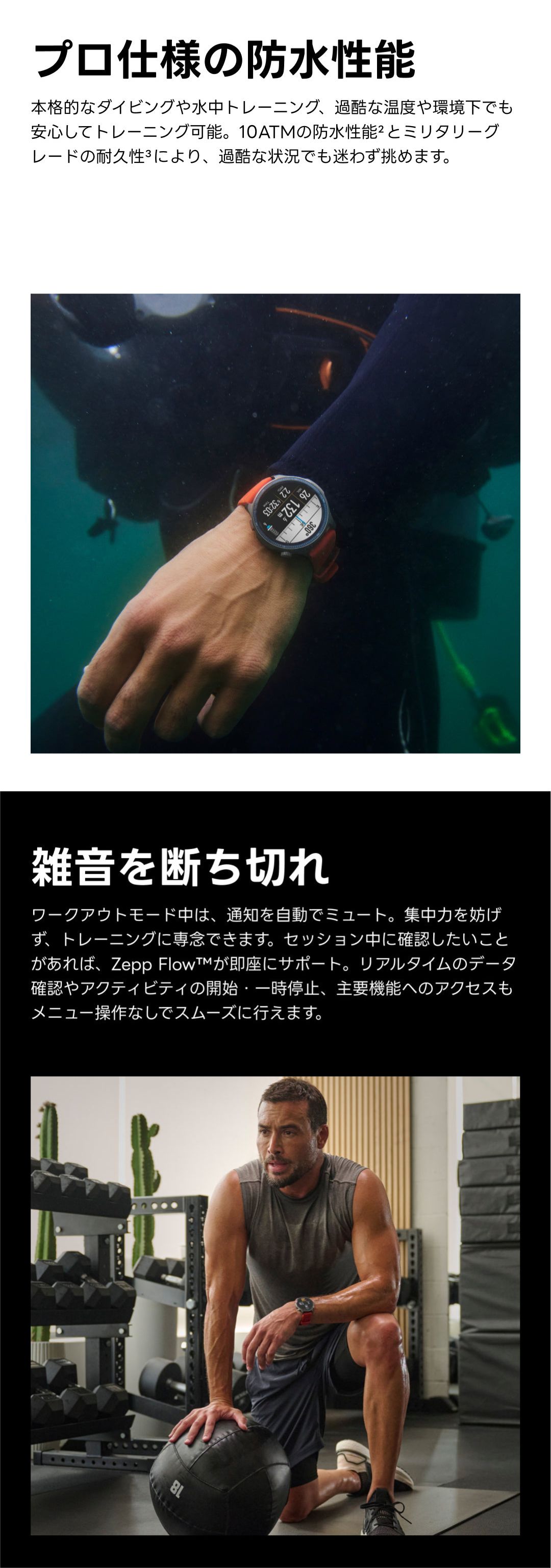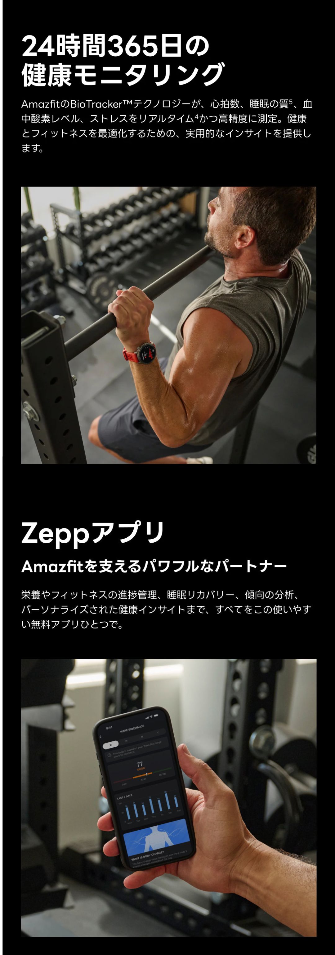 <バッテリー持続時間について> ●標準的な使用でのバッテリー駆動時間:最大21日間 ●省電力モードのバッテリー駆動時間:最大38日間 ●ハードな使用でのバッテリー駆動時間:最大10日間 ●AODモードでのバッテリー駆動時間:最大7日間 ●GPS連続駆動時間:最大33時間 ※バッテリー持続時間は設定、操作条件、およびその他の要因によって異なる場合があります。実際の結果は、実験室のデータと異なる場合があります。 <仕様> ◆デザイン ・カラー:ブラック(ラバのシリコンバンドが付属) ・サイズ:約47.4×47.4×12.3(心拍ベース除く)(心拍ベース含むと約12.5mm) ・重量:約60g(バンドの重さを含む)/約43g(バンド除く) ・ボディ素材:フレーム:アルミニウム合金、ケース:繊維強化樹脂 ・ボタン:2 ・防水グレード:有/10ATM(ISO 22810:2010規格に準ずる・レポート番号:68.189.25.0132.01)45メートルのフリーダイビングに対応 ◆ディスプレイ ・ディスプレイ素材:HD AMOLED ・ディスプレイサイズ:1.5インチ ・解像度:480×480 ・PPI:323 ・タッチスクリーン:サファイアガラス ◆バンド ・バンド素材:シリコン ・バンド長さ:シリコン:140-210 ・バンド幅:22mm ・バンド仕様:クラシックピンバックル ◆バッテリー ・バッテリー容量:658mAh ・充電方法:マグネット式充電 ・充電時間:約2時間 ◆スポーツ機能 ・スポーツモード:170+ ・スマート認識:8つのスポーツ ・スマート認識対応の筋力トレーニング:有 ・高度なランニングサポート:仮想ペーサー ・ワークアウトステータス:PeakBeats™(VO2Max、完全回復時間、トレーニングの負荷・効果など) ・インターバルトレーニング:有 ・フトレーニングテンプレート:有 ・外部デバイスへの接続:有 ・Zeppコーチ™:有 ・運動データのアナウンス:有(英語/中国語) ◆システム ・アプリ:Zepp アプリ※タブレット未対応 ・対応デバイス:Android7.0以上、iOS15.0以上 ・接続:Bluetooth 5.2 BLE、Wi-Fi(2.4GHz) ・搭載OS:Zepp OS 5 ・ミニアプリ:対応 ※一部日本語非対応 ・スリープモード:有 ・Alexa(日本語対応):無 ・オフライン音声アシスタント:有(日本語非対応) ・音声通話:有(受発信対応) ・アプリ通知:有 ・ウォッチフェイス:400+ ・表面温度測定:有 ◆ヘルス機能 ・レディネス:有 ・BioCharge:有"※アプリアップデートにて搭載予定" ・体組成測定:無 ・24時間モニタリング:心拍数/血中酸素レベル/ストレスレベル ・手動測定:心拍数/血中酸素レベル/ストレスレベル/ワンタップ測定(4つの健康指標) ・睡眠の質のモニタリング:睡眠段階(REMを含む) 昼寝の時間/睡眠スケジュール/睡眠時の呼吸の質/睡眠スコア ・健康評価システム:PAI ・呼吸エクササイズ:有(3種類) ・生理周期トラッキング:有 ・健康リマインダー:心拍数の異常/低血中酸素/高ストレスレベル/呼吸エクササイズ/座り過ぎのリマインダー ◆センサー ・健康:バイオトラッカー™PPG ・運動:加速度センサー、ジャイロスコープ、温度センサー、環境光センサー、地磁気センサー、気圧高度計 ・測位システム:デュアルバンド 6衛星測位(GPS、GLONASS、Galileo、BDS、QZSS、NavIC) ※屋内位置サービスはサポートされていません。 ・モーター:ローターモーター ◆その他 ・SMS返信※Androidのみ:有 ・LINE返信※Androidのみ:有 ・セット内容:時計本体(純正バンド含む)、専用充電ベース(ケーブルなし)、取扱説明書、シリコン交換バンド ・技適番号:217-252199 |