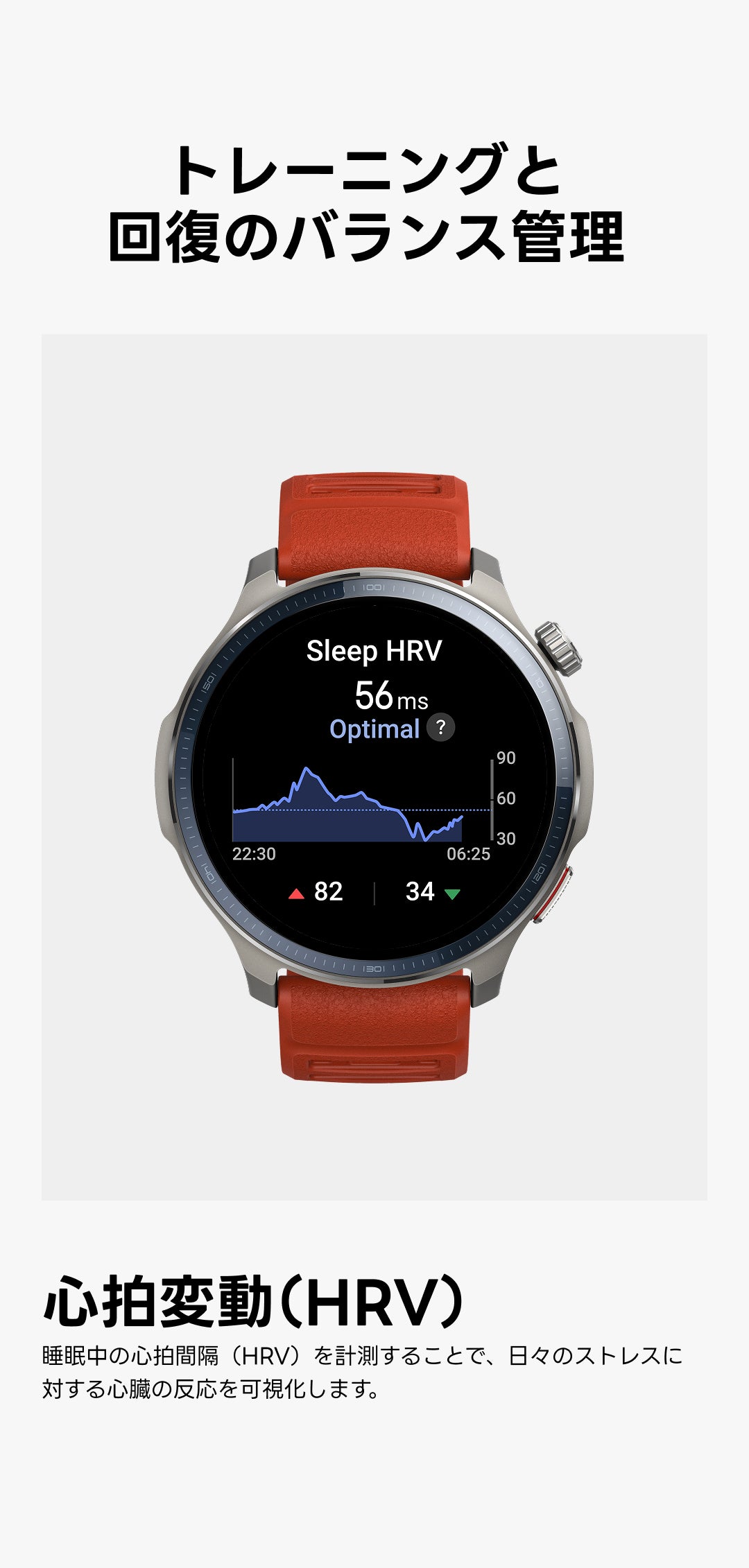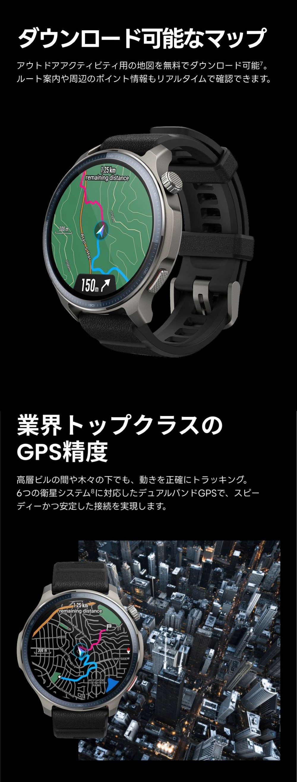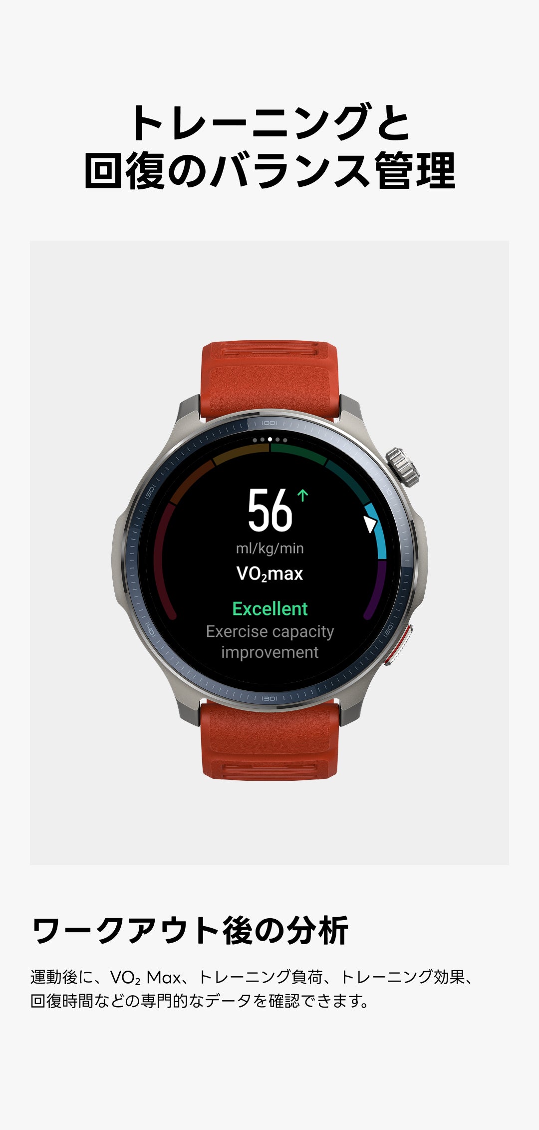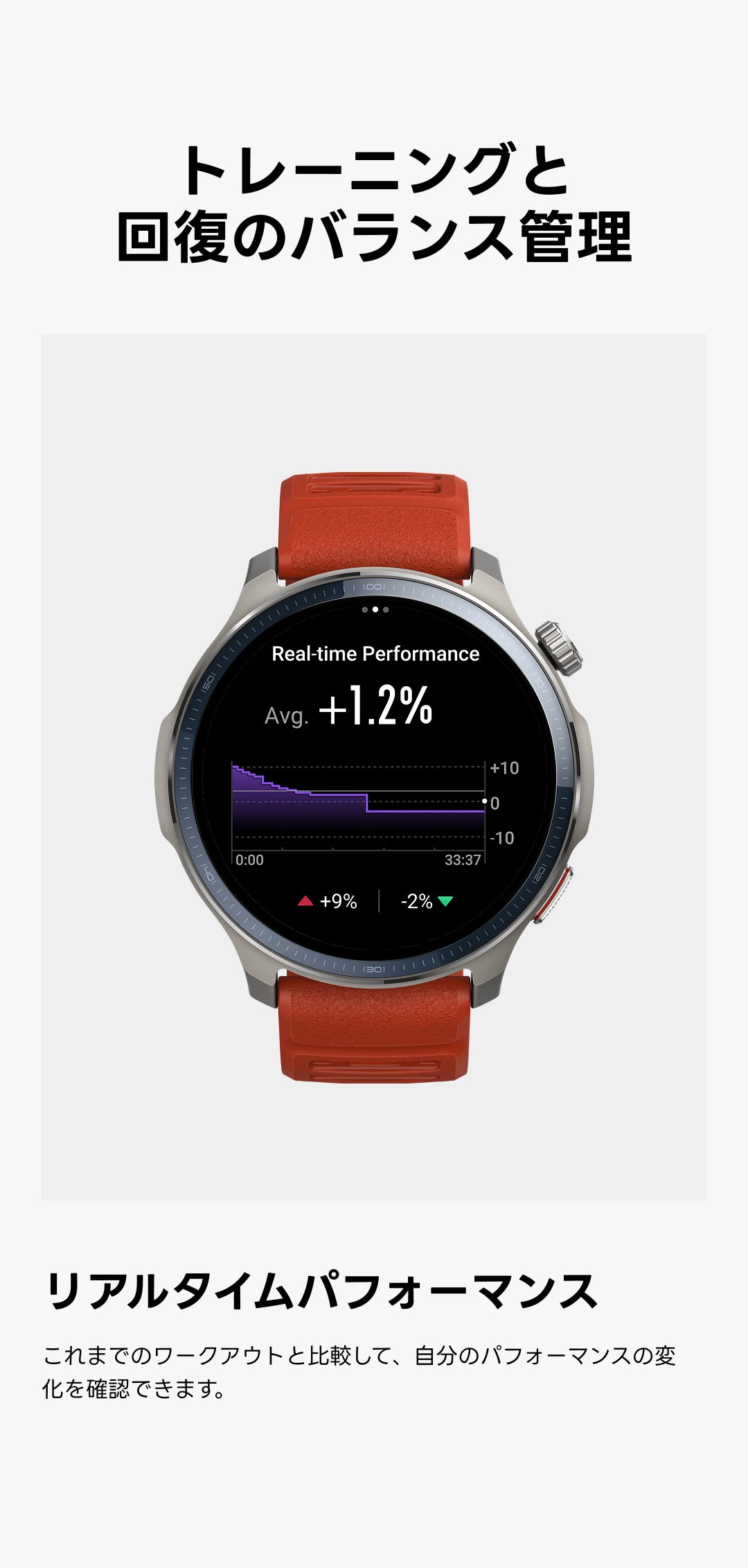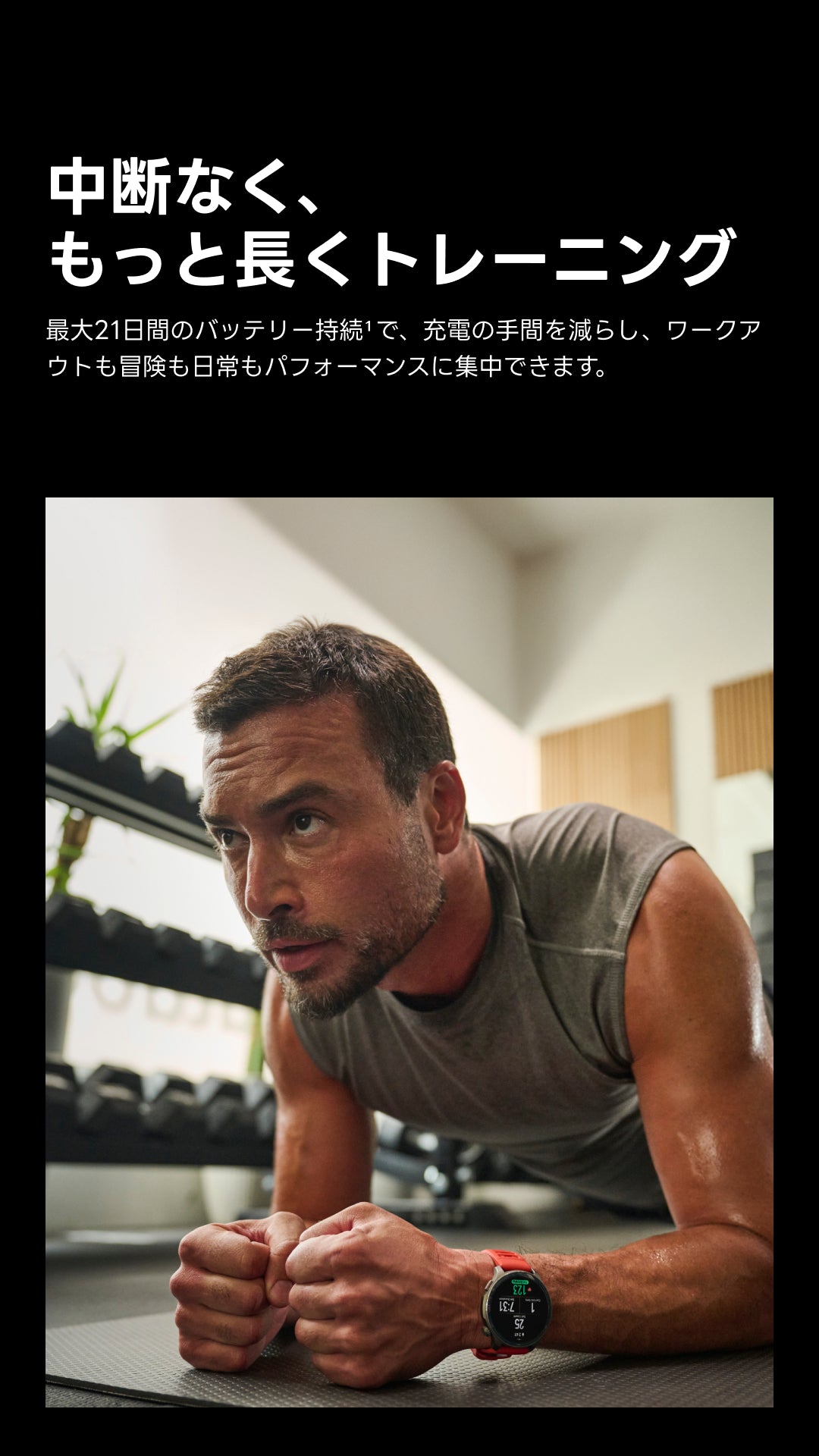 <バッテリー持続時間について> ●標準的な使用でのバッテリー駆動時間:最大21日間 ●省電力モードのバッテリー駆動時間:最大38日間 ●ハードな使用でのバッテリー駆動時間:最大10日間 ●AODモードでのバッテリー駆動時間:最大7日間 ●GPS連続駆動時間:最大33時間 ※バッテリー持続時間は設定、操作条件、およびその他の要因によって異なる場合があります。実際の結果は、実験室のデータと異なる場合があります。 <仕様> ◆デザイン ・カラー:ブラック(ラバのシリコンバンドが付属) ・サイズ:約47.4×47.4×12.3(心拍ベース除く)(心拍ベース含むと約12.5mm) ・重量:約60g(バンドの重さを含む)/約43g(バンド除く) ・ボディ素材:フレーム:アルミニウム合金、ケース:繊維強化樹脂 ・ボタン:2 ・防水グレード:有/10ATM(ISO 22810:2010規格に準ずる・レポート番号:68.189.25.0132.01)45メートルのフリーダイビングに対応 ◆ディスプレイ ・ディスプレイ素材:HD AMOLED ・ディスプレイサイズ:1.5インチ ・解像度:480×480 ・PPI:323 ・タッチスクリーン:サファイアガラス ◆バンド ・バンド素材:シリコン ・バンド長さ:シリコン:140-210 ・バンド幅:22mm ・バンド仕様:クラシックピンバックル ◆バッテリー ・バッテリー容量:658mAh ・充電方法:マグネット式充電 ・充電時間:約2時間 ◆スポーツ機能 ・スポーツモード:170+ ・スマート認識:8つのスポーツ ・スマート認識対応の筋力トレーニング:有 ・高度なランニングサポート:仮想ペーサー ・ワークアウトステータス:PeakBeats™(VO2Max、完全回復時間、トレーニングの負荷・効果など) ・インターバルトレーニング:有 ・フトレーニングテンプレート:有 ・外部デバイスへの接続:有 ・Zeppコーチ™:有 ・運動データのアナウンス:有(英語/中国語) ◆システム ・アプリ:Zepp アプリ※タブレット未対応 ・対応デバイス:Android7.0以上、iOS15.0以上 ・接続:Bluetooth 5.2 BLE、Wi-Fi(2.4GHz) ・搭載OS:Zepp OS 5 ・ミニアプリ:対応 ※一部日本語非対応 ・スリープモード:有 ・Alexa(日本語対応):無 ・オフライン音声アシスタント:有(日本語非対応) ・音声通話:有(受発信対応) ・アプリ通知:有 ・ウォッチフェイス:400+ ・表面温度測定:有 ◆ヘルス機能 ・レディネス:有 ・BioCharge:有"※アプリアップデートにて搭載予定" ・体組成測定:無 ・24時間モニタリング:心拍数/血中酸素レベル/ストレスレベル ・手動測定:心拍数/血中酸素レベル/ストレスレベル/ワンタップ測定(4つの健康指標) ・睡眠の質のモニタリング:睡眠段階(REMを含む) 昼寝の時間/睡眠スケジュール/睡眠時の呼吸の質/睡眠スコア ・健康評価システム:PAI ・呼吸エクササイズ:有(3種類) ・生理周期トラッキング:有 ・健康リマインダー:心拍数の異常/低血中酸素/高ストレスレベル/呼吸エクササイズ/座り過ぎのリマインダー ◆センサー ・健康:バイオトラッカー™PPG ・運動:加速度センサー、ジャイロスコープ、温度センサー、環境光センサー、地磁気センサー、気圧高度計 ・測位システム:デュアルバンド 6衛星測位(GPS、GLONASS、Galileo、BDS、QZSS、NavIC) ※屋内位置サービスはサポートされていません。 ・モーター:ローターモーター ◆その他 ・SMS返信※Androidのみ:有 ・LINE返信※Androidのみ:有 ・セット内容:時計本体(純正バンド含む)、専用充電ベース(ケーブルなし)、取扱説明書、シリコン交換バンド ・技適番号:217-252199 |