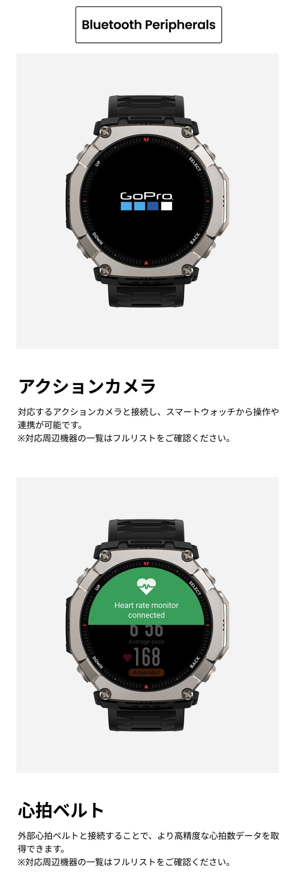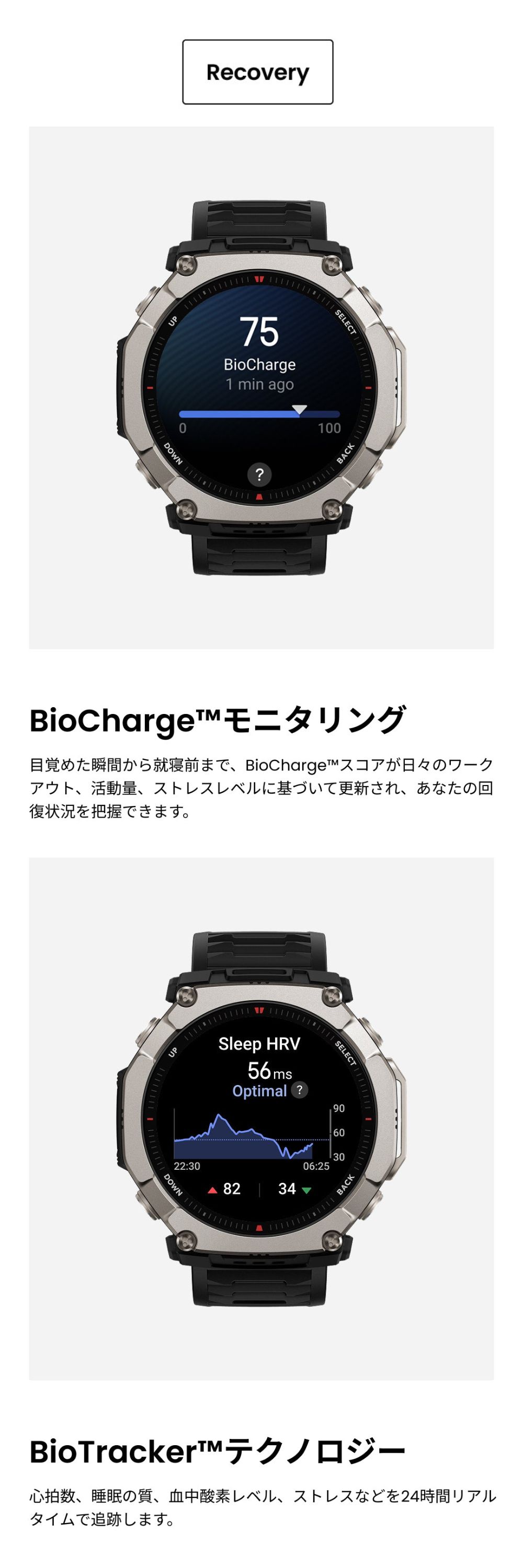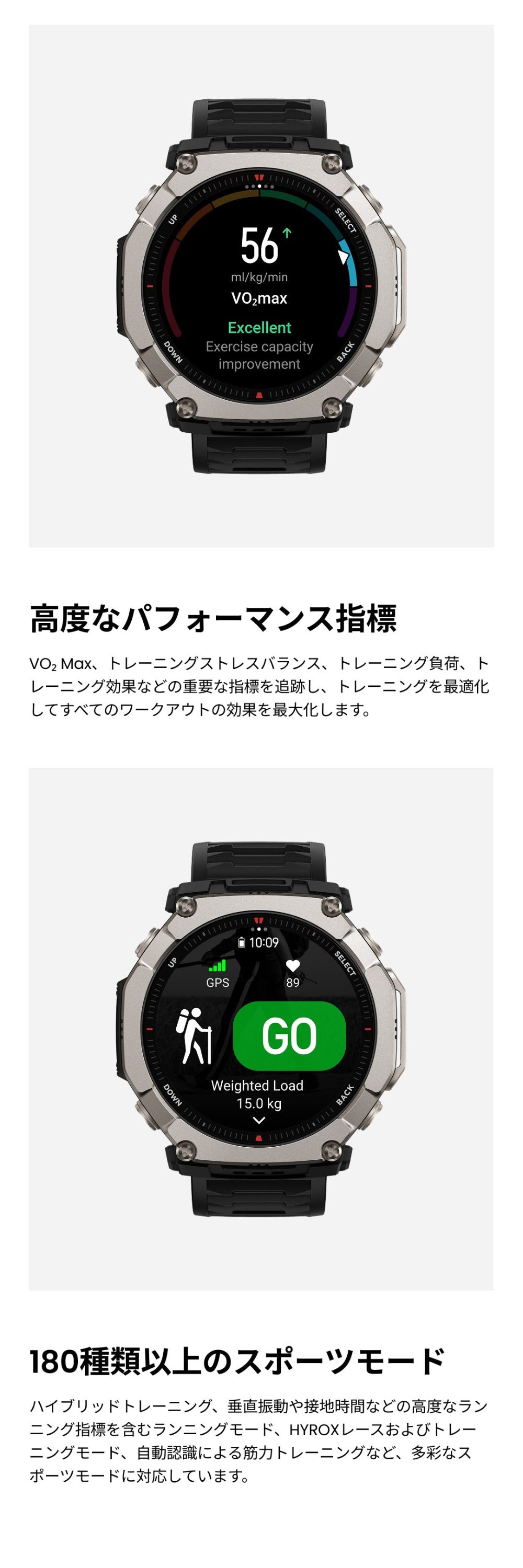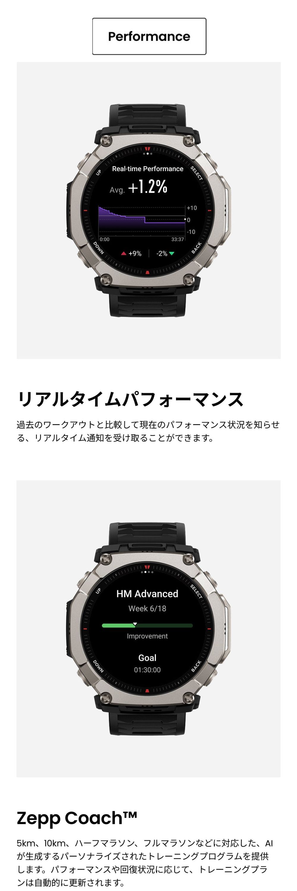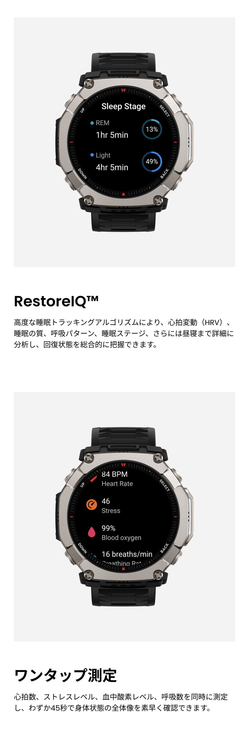 バッテリー持続時間について ●標準的な使用でのバッテリー駆動時間:最大30日間 ●ハードな使用でのバッテリー駆動時間:最大15日間 ●精度GPSモード:最大50時間 ●省電力GPSモード:最大90時間 ※バッテリー持続時間は設定、操作条件、およびその他の要因によって異なる場合があります。実際の結果は、実験室のデータと異なる場合があります。 仕様 ■デザイン カラー:ブラックマグマ サイズ:約51.0mm×51.0mm×14.3 mm 重量:約89.2g(バンドの重さを含む)/約67.5g(バンド除く) ボディ素材:グレード5チタン合金・繊維強化ポリマー ボタン:4 防水グレード:有/10ATM ■ディスプレイ ディスプレイ素材:HD AMOLED ディスプレイサイズ:1.5インチ 解像度:480×480 PPI:322 タッチスクリーン:サファイアガラス ■バンド バンド素材:シリコン バンド長さ:シリコン 145-215 バンド幅:26mm バンド仕様:クラシックピンバックル ■バッテリー バッテリー容量:870 mAh(標準値) 充電方法:マグネット式充電 充電時間:約2時間 ■スポーツ機能 スポーツモード:170+ スマート認識:8つのスポーツ スマート認識対応の筋力トレーニング:○ 高度なランニングサポート:仮想ペーサー ワークアウトステータス:PeakBeats™(VO2Max、完全回復時間、トレーニングの負荷・効果など) インターバルトレーニング:○ トレーニングテンプレート:○ 外部デバイスへの接続:○ Zeppコーチ™:○ 運動データのアナウンス:○(英語/中国語) ■システム アプリ:Zepp アプリ※タブレット未対応 対応デバイス:Android7.0以上、iOS14.0以上 接続:Bluetooth 5.2 BLE 搭載OS:Zepp OS 5 ミニアプリ:対応 ※一部日本語非対応 スリープモード:○ Alexa(日本語対応):× オフライン音声アシスタント:○(日本語非対応) 音声通話:○(受発信対応) アプリ通知:○ ウォッチフェイス:200+ 表面温度測定:○ MIL規格:○ ダイビング:○ 音楽コントロール:○ 音楽ストレージ 約64GB 超低温モード:× コンパス:○ 気圧高度計:○ 高度アシスタント:× 高度血中酸素レベルリマインダー:× 太陽と月:○ 潮汐:○ 嵐アラート:○ フリーダイビングの水温:× ナビゲーション:○ オフラインマップ:○ ■ヘルス機能 レディネス:× BioCharge:○ 体組成測定:× 24時間モニタリング:心拍数/血中酸素レベル/ストレスレベル 手動測定:心拍数/血中酸素レベル/ストレスレベル/ワンタップ測定(4つの健康指標) 睡眠の質のモニタリング:睡眠段階(REMを含む) 昼寝の時間/睡眠スケジュール/睡眠時の呼吸の質/睡眠スコア 健康評価システム:PAI 呼吸エクササイズ:○(3種類) 生理周期トラッキング:○ 健康リマインダー:高心拍数・低心拍数/低血中酸素/ストレス緩和通知/スタンドリマインダー ■センサー 健康:PPG 心拍センサー (5PD + 2LED) 運動:3軸加速度センサー、3軸ジャイロセンサー、地磁気センサー、気圧高度計、環境光センサー、温度センサー 測位システム:デュアルバンド円偏波GPSアンテナ6衛星測位システム (GPS, GLONASS, Galileo, BDS, QZSS、NavIC) ※屋内位置サービスはサポートされていません。 モーター:リニアモーター ■その他 SMS返信※Androidのみ:○ LINE返信※Androidのみ:○ セット内容:時計本体(純正バンド含む)、専用充電ベース(ケーブルなし)、取扱説明書 技適番号:R 020-250409 |