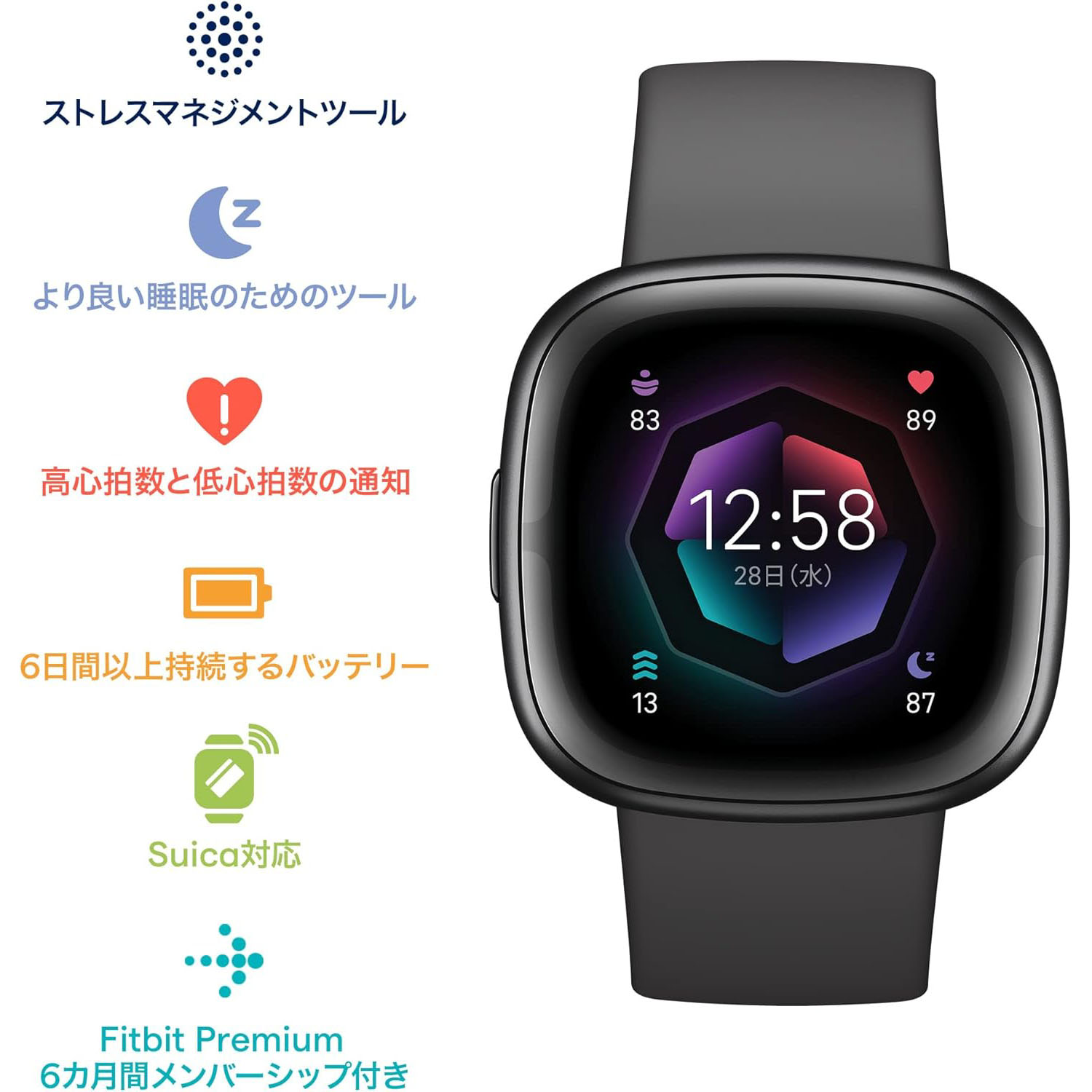 仕様 寸法と重量: 縦:40.5mm 横:40.5mm 高さ:11.2mm 重量:37.64g バッテリー&充電 バッテリーライフは6日間以上。バッテリーの駆動時間と充電サイクルは、使用方法や設定、その他の要因によって変化するため、実際の駆動時間は一定ではありません。常時画面表示モード、血中酸素ウェルネス機能、cEDA センサーを使用する場合は、より頻繁な充電が必要となります。GPS の継続使用時は最大5時間です。データの測定が中断しないよう、2~3日に一度、デバイスを充電することをおすすめします。 データ保存 1分単位の詳細なモーションデータを7日間保存します 動作環境 動作温度:-10°C~45°C センサー&パーツ ・マルチパス光学式心拍数センサー ・皮膚コンダクタンスを測定する電気センサー(cEDA)が身体反応を計測 ・血中酸素ウェルネス測定用の赤色および赤外線センサー. 一部の国地域で利用可能です。医療的な診断や治療、その他の医療目的での使用を意図した機能ではありません。健康管理と情報記録の支援を目的とした機能です。利用時には、より頻繁な充電が必要となります。 ・高度計 ・3軸加速度計 ・推定睡眠時皮膚温センサー。Fitbit アプリでのみ利用可能です。変動値のみ表示されます。一部の地域でご利用いただけます。医療目的での使用はできません。周囲温度が大幅に変化した場合、皮膚温の推定に影響を与える可能性があります。 ・環境光センサー ・WiFi(無効、オンにできません) ・NFC ・GPS 搭載 + GLONASS ・振動モーター ・スピーカー(75dB SPL @10cm) ・マイク ディスプレイ ・AMOLED ディスプレイ ・CorningR GorillaR Glass 3 耐水性能 水深50mまでの耐水仕様です。ベルトが濡れた場合には、ベルトをよく乾かしてください。ウェアラブルデバイスを使用する際は、肌にトラブルが起きないよう、ベルトを常に清潔で乾燥した状態に保つことをおすすめします。さらに詳しく。 材質 このスマートウォッチは、多くのスポーツウォッチで使用されているような柔軟性に優れた素材をベルトとバックルに採用。ウォッチケースはアルミニウム製です。 ベルトのサイズ 商品パッケージには、SサイズとLサイズの両方が同梱されています。 ・Sサイズ:手首周り130mm~180mmにフィットします ・Lサイズ:手首周り165mm~220mmにフィットします 同梱品 Fitbit Sense 2 クラシックベルト(SサイズとLサイズ) 充電ケーブル 要件 Googleのアカウントが必要です。さらに詳しく。 Fitbitアプリは、広く普及しているスマートフォンに対応しています。Fitbitの製品やサービスをセットアップして使用するには、次のオペレーティングシステムのいずれかを搭載している互換性のあるデバイスに、Fitbitアプリをインストールする必要があります: ・Apple iOS 16.4以降。 ・Android OS 11.0以上。Androidスマートフォンに関する>ヒントもご覧ください。 ・同期範囲:最大 9m ・スマートフォンの通知など、一部の機能の使用には、Android 11以上のバージョンが必要になる場合があります。>デバイスの互換性を確認する。 ・同期には、BluetoothR LE、インターネット接続、およびスマートフォンでの位置情報の利用許可が必要です。 |