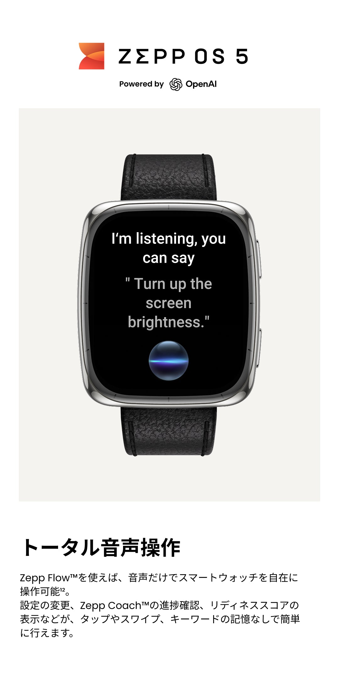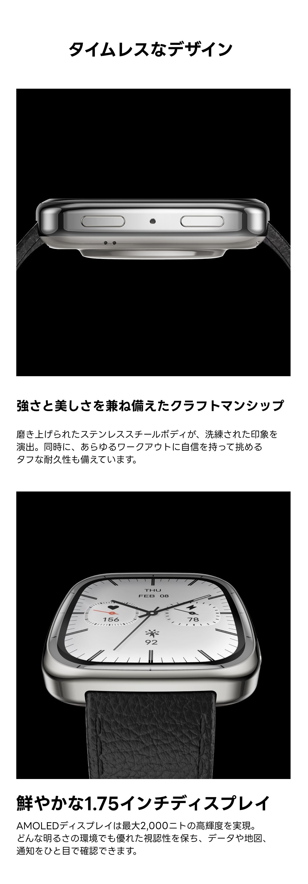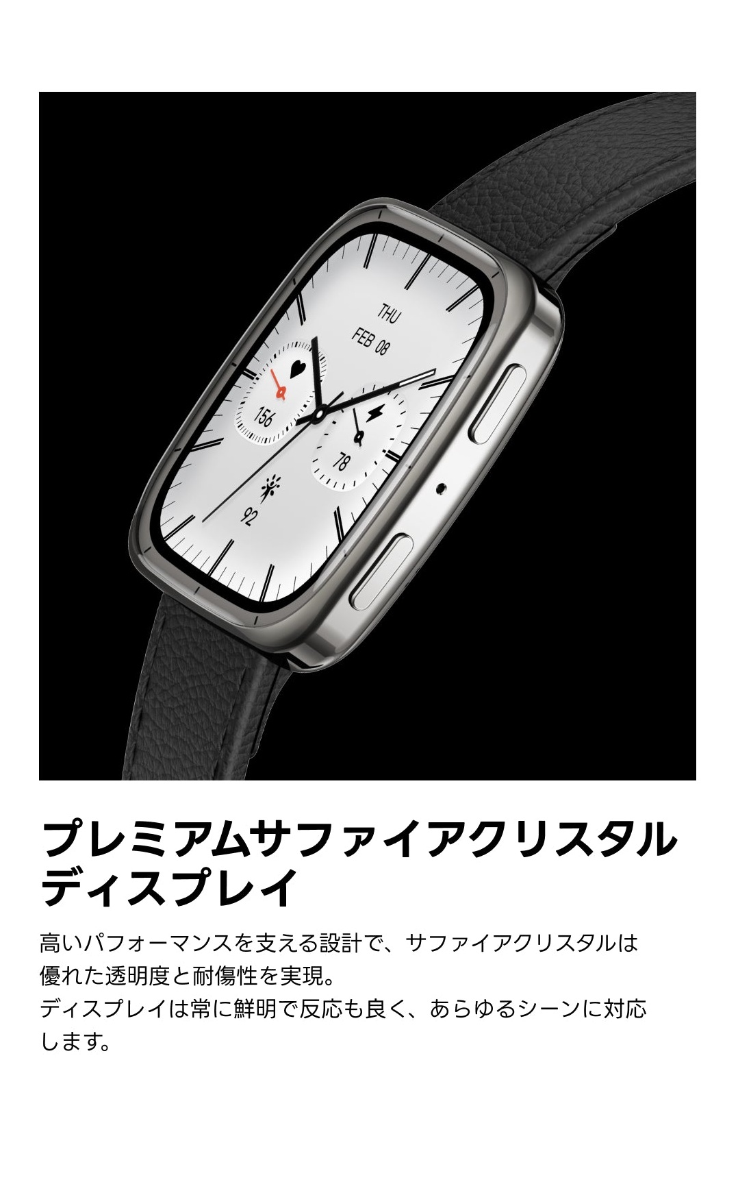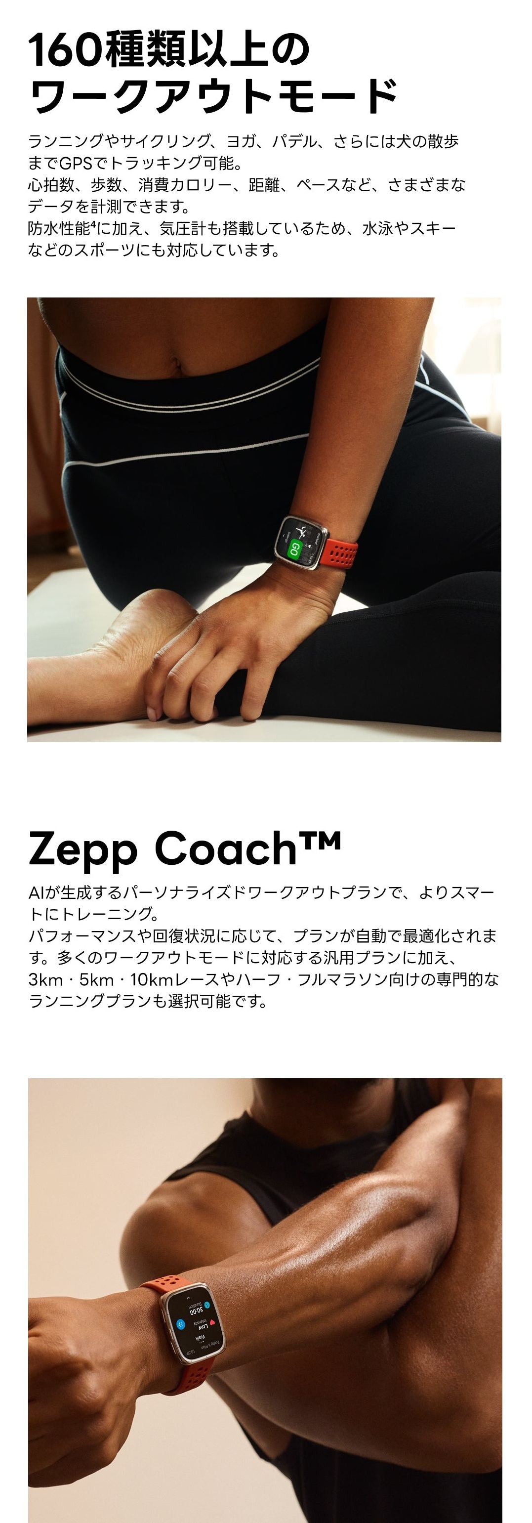 <バッテリー持続時間について> ●標準的な使用でのバッテリー駆動時間:最大10日間 ●省電力モードのバッテリー駆動時間:最大19日間 ●ハードな使用でのバッテリー駆動時間:最大5日間 ●AODモードでのバッテリー駆動時間:最大7日間 ●GPS連続駆動時間:最大21時間 ※バッテリー持続時間は設定、操作条件、およびその他の要因によって異なる場合があります。実際の結果は、実験室のデータと異なる場合があります。 <仕様> ◆デザイン カラー:ブラックレザー サイズ:約43.32×36.9×9.0(心拍ベース除く)(心拍ベース含むと約11mm) 重量:約42g(バンドの重さを含む)/約31.4g(バンド除く) ボディ素材:フレーム:ステンレススチール、ケース:繊維強化樹脂 ボタン:2 防水グレード:有/5ATM(ISO 22810:2010規格に準ずる・レポート番号:SHES250300481871) マイク:有 スピーカー:有 ◆ディスプレイ ディスプレイ素材:HD AMOLED ディスプレイサイズ:1.75インチ 解像度:390×450 PPI:341 タッチスクリーン:サファイアガラス ◆バンド バンド素材:レザー バンド長さ:レザー:150-210 バンド幅:20mm バンド仕様:クラシックピンバックル ◆バッテリー バッテリー容量:260mAh 充電方法:マグネット式充電 充電時間:約2時間 ◆スポーツ機能 スポーツモード:160+ スマート認識:8つのスポーツ スマート認識対応の筋力トレーニング:有 高度なランニングサポート:仮想ペーサー ワークアウトステータス:PeakBeats(VO2Max、完全回復時間、トレーニングの負荷・効果など) インターバルトレーニング:有 フトレーニングテンプレート:有 外部デバイスへの接続:有 Zeppコーチ〓:有 運動データのアナウンス:有 ◆システム アプリ:Zepp アプリ※タブレット未対応 対応デバイス:Android7.0以上、iOS15.0以上 接続:Bluetooth 5.2 BLE 搭載OS:Zepp OS 5 ミニアプリ:対応 ※一部日本語非対応 スリープモード:有 Alexa(日本語対応):無 オフライン音声アシスタント:有(日本語非対応) 音声通話:有(受発信対応) アプリ通知:有 ウォッチフェイス:400+ 表面温度測定:有 ◆ヘルス機能 レディネス:有 体組成測定:無 24時間モニタリング:心拍数/血中酸素レベル/ストレスレベル 手動測定:心拍数/血中酸素レベル/ストレスレベル/ワンタップ測定(4つの健康指標) 睡眠の質のモニタリング:睡眠段階(REMを含む) 昼寝の時間/睡眠スケジュール/睡眠時の呼吸の質/睡眠スコア 健康評価システム:PAI 呼吸エクササイズ:有(3種類) 生理周期トラッキング:有 健康リマインダー:心拍数の異常/低血中酸素/高ストレスレベル/呼吸エクササイズ/座り過ぎのリマインダー ◆センサー 健康:バイオトラッカーPPG 運動:加速度センサー、ジャイロスコープ、温度センサー、環境光センサー、地磁気センサー、気圧高度計 測位システム:円偏波GPSアンテナ 5衛星測位(GPS、GLONASS、Galileo、BDS、QZSS) ※屋内位置サービスはサポートされていません。 モーター:ローターモーター ◆その他 SMS返信※Androidのみ:有 LINE返信※Androidのみ:有 セット内容:時計本体(純正バンド含む)、専用充電ベース(ケーブルなし)、取扱説明書 技適番号:020-250080 |
