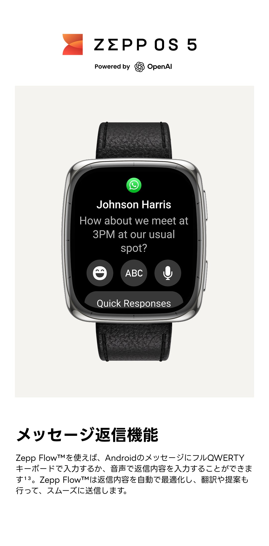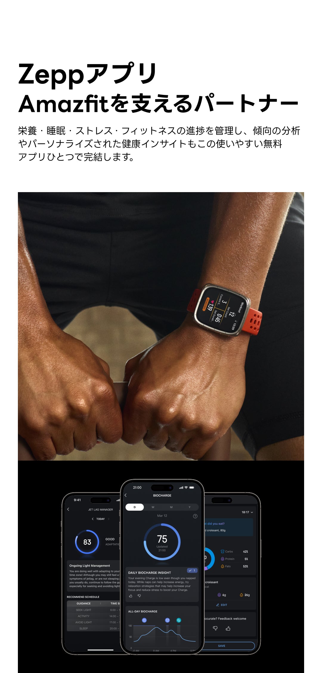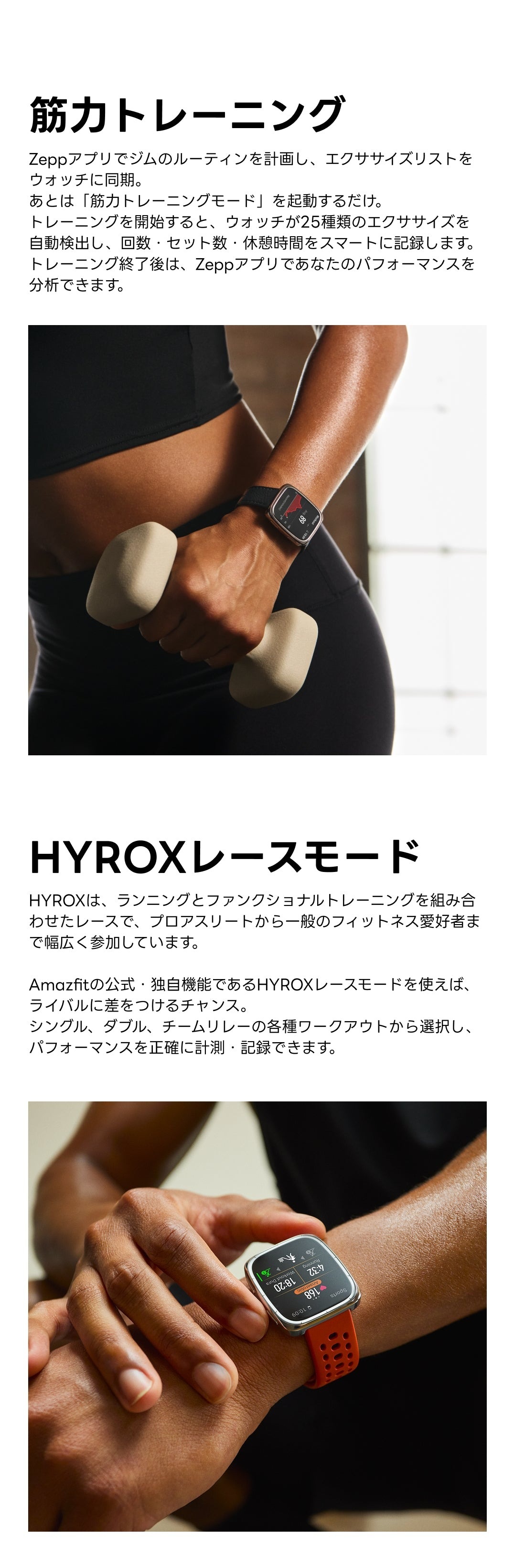 <バッテリー持続時間について> ●標準的な使用でのバッテリー駆動時間:最大10日間 ●省電力モードのバッテリー駆動時間:最大19日間 ●ハードな使用でのバッテリー駆動時間:最大5日間 ●AODモードでのバッテリー駆動時間:最大7日間 ●GPS連続駆動時間:最大21時間 ※バッテリー持続時間は設定、操作条件、およびその他の要因によって異なる場合があります。実際の結果は、実験室のデータと異なる場合があります。 <仕様> ◆デザイン カラー:ブラックレザー サイズ:約43.32×36.9×9.0(心拍ベース除く)(心拍ベース含むと約11mm) 重量:約42g(バンドの重さを含む)/約31.4g(バンド除く) ボディ素材:フレーム:ステンレススチール、ケース:繊維強化樹脂 ボタン:2 防水グレード:有/5ATM(ISO 22810:2010規格に準ずる・レポート番号:SHES250300481871) マイク:有 スピーカー:有 ◆ディスプレイ ディスプレイ素材:HD AMOLED ディスプレイサイズ:1.75インチ 解像度:390×450 PPI:341 タッチスクリーン:サファイアガラス ◆バンド バンド素材:レザー バンド長さ:レザー:150-210 バンド幅:20mm バンド仕様:クラシックピンバックル ◆バッテリー バッテリー容量:260mAh 充電方法:マグネット式充電 充電時間:約2時間 ◆スポーツ機能 スポーツモード:160+ スマート認識:8つのスポーツ スマート認識対応の筋力トレーニング:有 高度なランニングサポート:仮想ペーサー ワークアウトステータス:PeakBeats(VO2Max、完全回復時間、トレーニングの負荷・効果など) インターバルトレーニング:有 フトレーニングテンプレート:有 外部デバイスへの接続:有 Zeppコーチ〓:有 運動データのアナウンス:有 ◆システム アプリ:Zepp アプリ※タブレット未対応 対応デバイス:Android7.0以上、iOS15.0以上 接続:Bluetooth 5.2 BLE 搭載OS:Zepp OS 5 ミニアプリ:対応 ※一部日本語非対応 スリープモード:有 Alexa(日本語対応):無 オフライン音声アシスタント:有(日本語非対応) 音声通話:有(受発信対応) アプリ通知:有 ウォッチフェイス:400+ 表面温度測定:有 ◆ヘルス機能 レディネス:有 体組成測定:無 24時間モニタリング:心拍数/血中酸素レベル/ストレスレベル 手動測定:心拍数/血中酸素レベル/ストレスレベル/ワンタップ測定(4つの健康指標) 睡眠の質のモニタリング:睡眠段階(REMを含む) 昼寝の時間/睡眠スケジュール/睡眠時の呼吸の質/睡眠スコア 健康評価システム:PAI 呼吸エクササイズ:有(3種類) 生理周期トラッキング:有 健康リマインダー:心拍数の異常/低血中酸素/高ストレスレベル/呼吸エクササイズ/座り過ぎのリマインダー ◆センサー 健康:バイオトラッカーPPG 運動:加速度センサー、ジャイロスコープ、温度センサー、環境光センサー、地磁気センサー、気圧高度計 測位システム:円偏波GPSアンテナ 5衛星測位(GPS、GLONASS、Galileo、BDS、QZSS) ※屋内位置サービスはサポートされていません。 モーター:ローターモーター ◆その他 SMS返信※Androidのみ:有 LINE返信※Androidのみ:有 セット内容:時計本体(純正バンド含む)、専用充電ベース(ケーブルなし)、取扱説明書 技適番号:020-250080 |