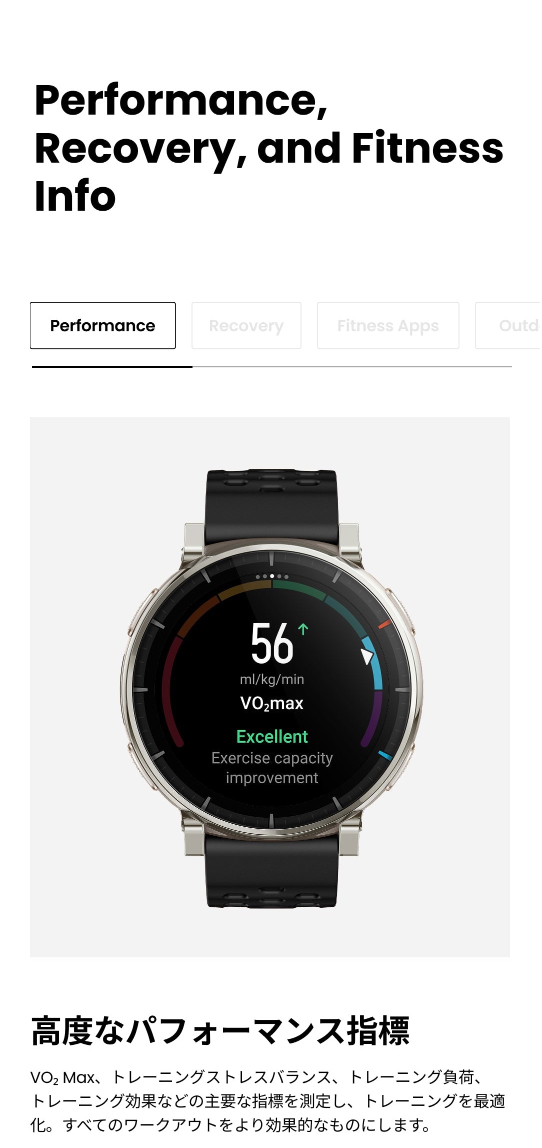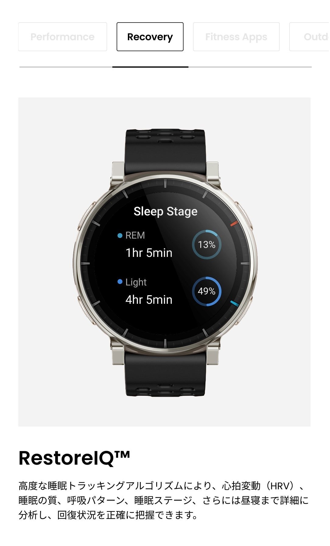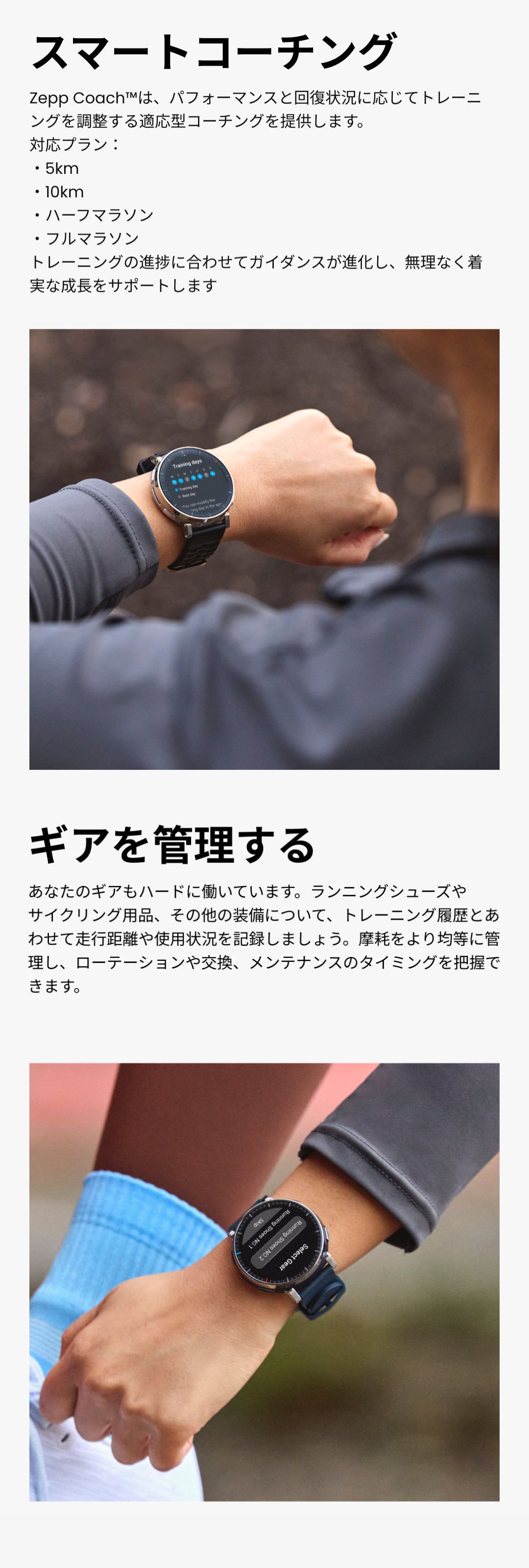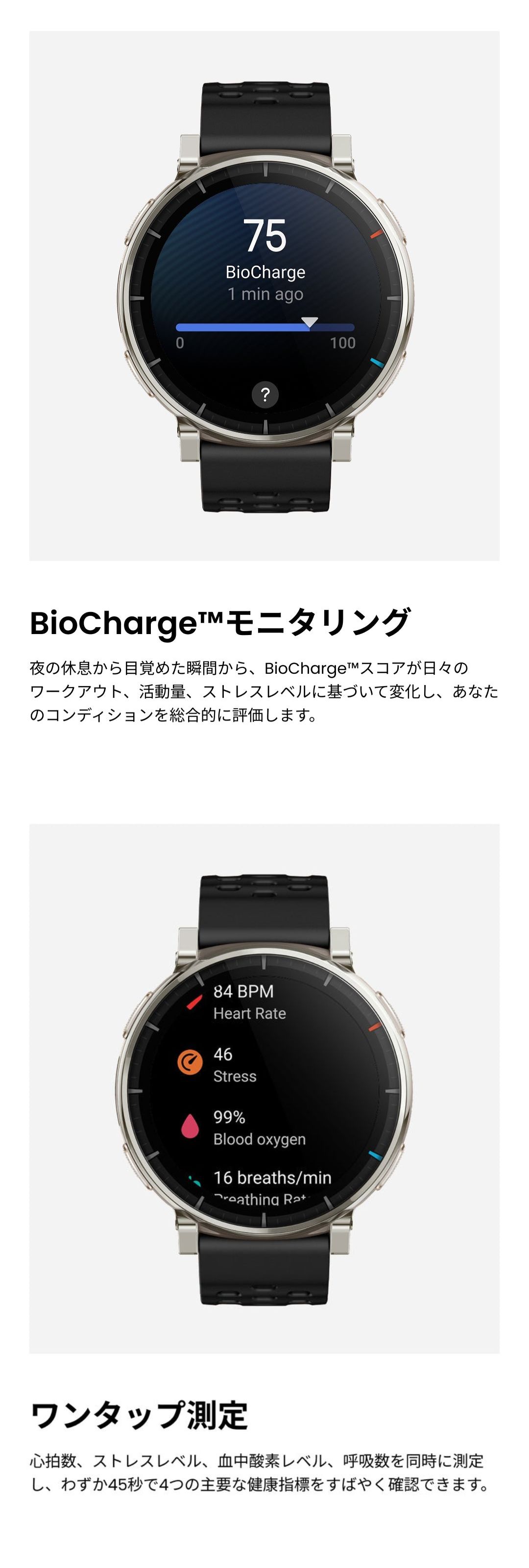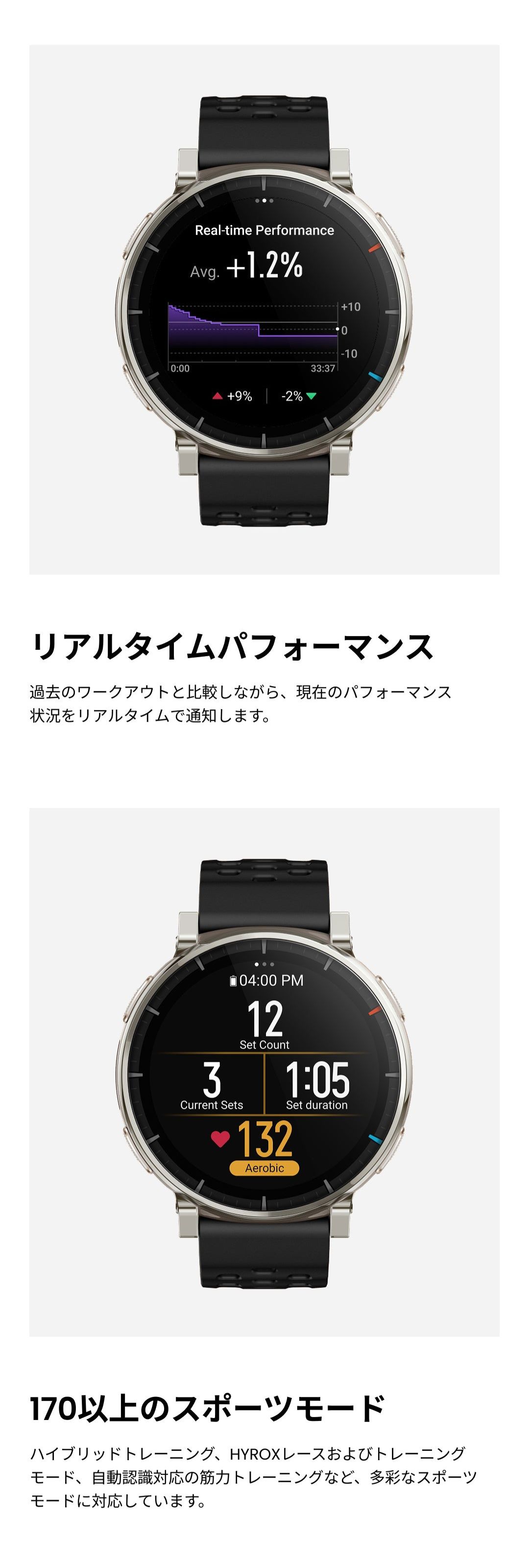 バッテリー持続時間について ●標準的な使用でのバッテリー駆動時間:最大12日間 ●ハードな使用でのバッテリー駆動時間:最大7日間 ●GPSモード (単一周波数、複数衛星捕捉、サンプリングレート1秒):最大24時間 ●省電力GPSモード:最大72時間 ※バッテリー持続時間は設定、操作条件、およびその他の要因によって異なる場合があります。実際の結果は、実験室のデータと異なる場合があります。 仕様 ■デザイン カラー:アトラスブルー サイズ:約45.0mm * 45.0mm * 11 mm 重量:約54.6g(バンドの重さを含む)/約38g(バンド除く) ボディ素材:ステンレススチール、繊維強化樹脂 ボタン:4 防水グレード:有/5ATM ■ディスプレイ ディスプレイ素材:HD AMOLED ディスプレイサイズ:1.32インチ 解像度:466 x 466 PPI:353 タッチスクリーン:サファイアガラス ■バンド バンド素材:シリコン バンド長さ:135-210 mm バンド幅:20mm バンド仕様:クラシックピンバックル ■バッテリー バッテリー容量:365mAh 充電方法:マグネット式充電 充電時間:約2時間 ■スポーツ機能 スポーツモード:170+ スマート認識:8つのスポーツ スマート認識対応の筋力トレーニング:有 高度なランニングサポート:仮想ペーサー ワークアウトステータス:PeakBeats™(VO2Max、完全回復時間、トレーニングの負荷・効果など) インターバルトレーニング:有 トレーニングテンプレート:有 外部デバイスへの接続:有 Zeppコーチ™:有 運動データのアナウンス:有(英語/中国語) ■システム アプリ:Zepp アプリ※タブレット未対応 対応デバイス:Android7.0以上、iOS14.0以上 接続:Bluetooth 5.3 BLE 搭載OS:Zepp OS 4.5 ミニアプリ:対応 ※一部日本語非対応 スリープモード:有 Alexa(日本語対応):無 オフライン音声アシスタント:有(日本語非対応) 音声通話:有(受発信対応) アプリ通知:有 ウォッチフェイス:200+ 表面温度測定:有 MIL規格:無 ダイビング:無 音楽コントロール:有 音楽ストレージ:約4GB 超低温モード:無 コンパス:有 気圧高度計:有 高度アシスタント:無 高度血中酸素レベルリマインダー:無 太陽と月:有 潮汐:有 嵐アラート:有 フリーダイビングの水温:無 ナビゲーション:有 オフラインマップ:有 ■ヘルス機能 レディネス:無 BioCharge:有 体組成測定:無 24時間モニタリング:心拍数/血中酸素レベル/ストレスレベル 手動測定:心拍数/血中酸素レベル/ストレスレベル/ワンタップ測定(4つの健康指標) 睡眠の質のモニタリング:睡眠段階(REMを含む) 昼寝の時間/睡眠スケジュール/睡眠時の呼吸の質/睡眠スコア 健康評価システム:PAI 呼吸エクササイズ:有(3種類) 生理周期トラッキング:有 健康リマインダー:高心拍数・低心拍数/低血中酸素/ストレス緩和通知/スタンドリマインダー ■センサー 健康:PPG 心拍センサー (5PD + 2LED) 運動:6軸加速度センサー、6軸ジャイロスコープ、温度センサー、環境光センサー、地磁気センサー、気圧高度センサー 測位システム:デュアルバンド円偏波GPSアンテナ6衛星測位システム (GPS, GLONASS, Galileo, BDS, QZSS、NaviC) ※屋内位置サービスはサポートされていません。 モーター:リニアモーター ■その他 SMS返信※Androidのみ:有 LINE返信※Androidのみ:有 セット内容:時計本体(純正バンド含む)、専用充電ベース(ケーブルなし)、取扱説明書 技適番号:R 217-252924 |