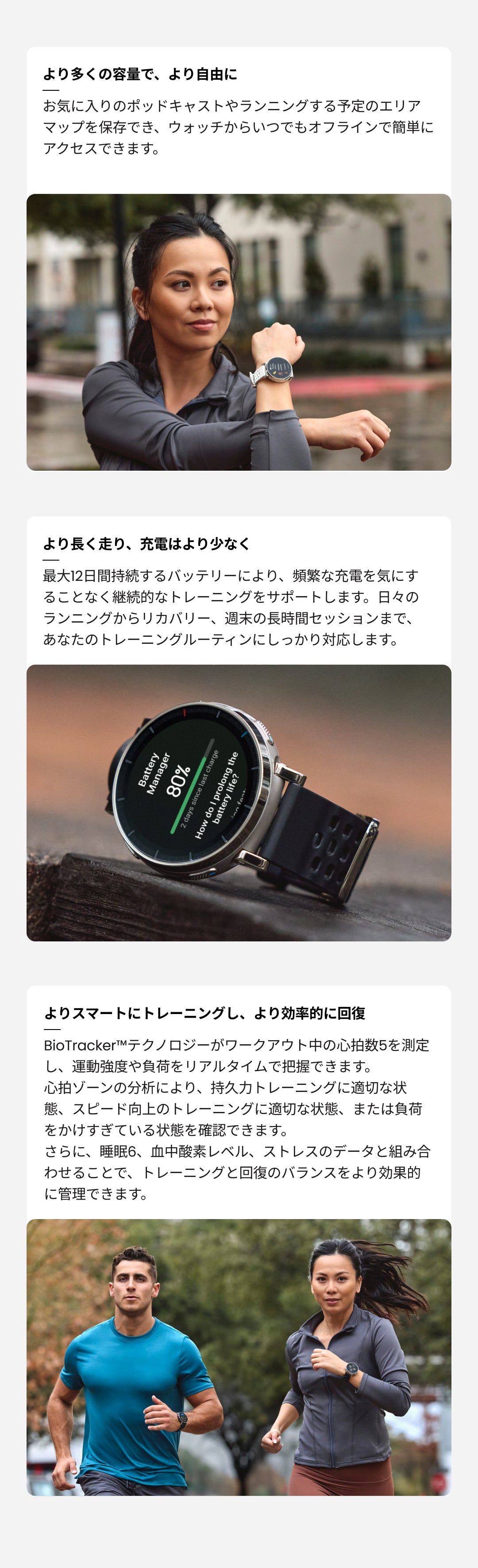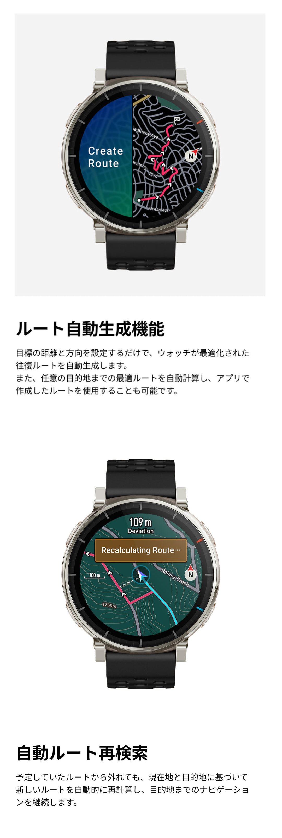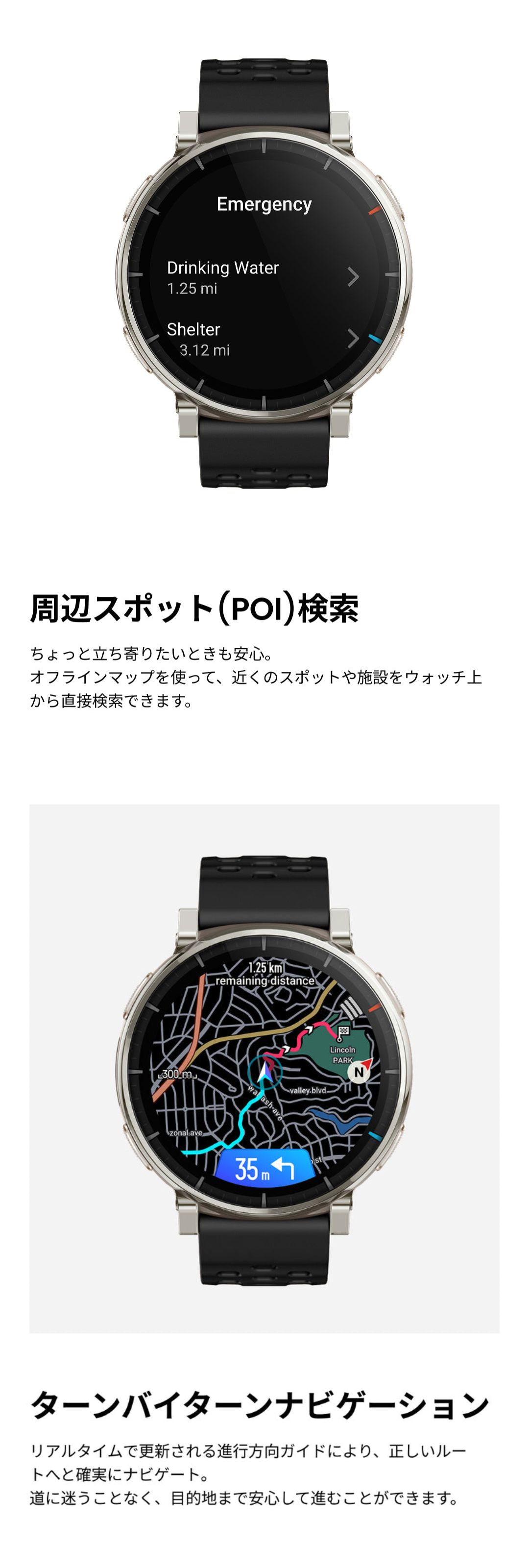 アトラスブルー ![]() ■1.32インチのAMOLEDディスプレイ ■画面最大輝度3,000nitで視認性がアップ ■サファイアガラスカバー、耐擦傷性を向上し、グローブモードにも対応 ■4ボタンインタラクションにより、運動中の操作がより正確に ■最大12日間持続のバッテリー性能 ■4GBの容量で、最大500曲の音楽ダウンロードや操作性が向上した地図機能が使用可能 ■ダウンロード可能なベースマップ(街路)、等高線、スキーリゾートマップ ■ウォッチ上で直接、またはZeppアプリでルート作成可能 ■ターンバイターン方式のルート案内 ■オフラインでのポイントツーポイントルートプランニング ■近隣のPOI(興味のある場所) ■自動ルート変更機能 ![]() ![]() ![]() ![]() ![]() ![]() ![]() ![]() ![]() ![]() ![]() ![]() ![]() ![]() ![]() |